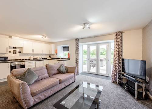 Open-plan spacious kitchen/living area with doors opening onto decking featuring a barbecue and outdoor hot tub