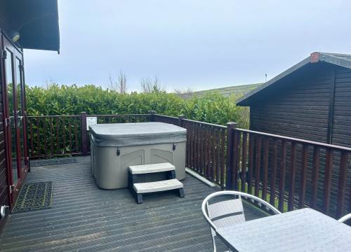 Outside has an enclosed raised decking area with garden furniture and hot tub. There is parking for one car to the side of this lodge.