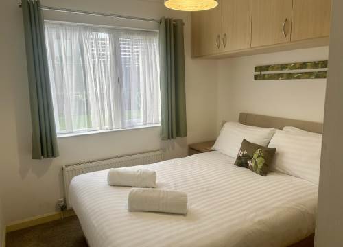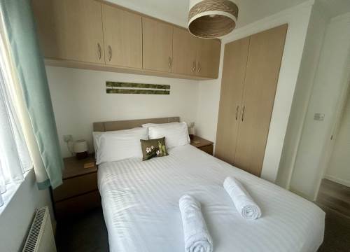 This holiday lodge offers one double bedroom with walk in wardrobe and one twin room with small single beds. Pets welcome.
