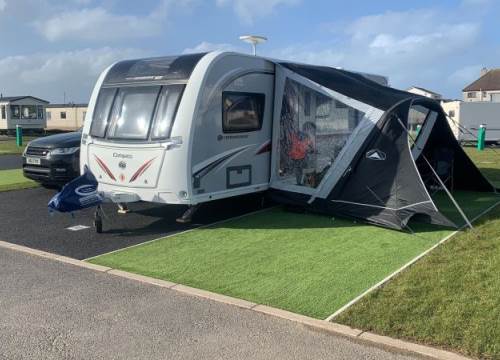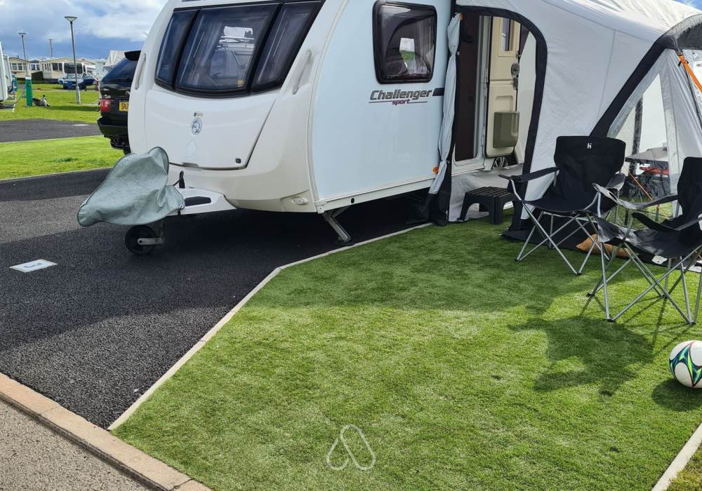 Some pitches are longer - pitches 14 to 18 - and more suitable for motorhomes. Artificial grass offers further comfort, and securing awnings will require metal pegs, which are to be inserted in the natural grass just at the edge of the artificial grass, and, if required for just next to a caravan, sandbags (supplied) for tying to.