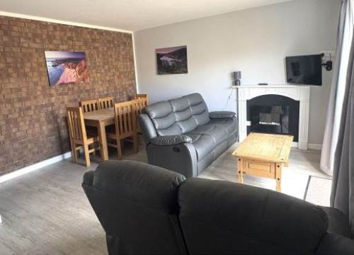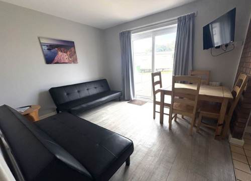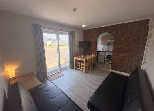 One bedroom apartment with well equipped kitchen and bathroom with walk in shower. Comprises of 1 double bed and sleeping arrangement for 2 in the lounge with patio doors, TV, coffee machine and WIFI. Onsite facilities include arcade, play park, swimming pool with slide, outdoor gym, shop, family bar and bistro and launderette. Breakfast and evening meals in bistro available most of the year. CCTV, free parking. Near Royal Portrush Golf Club , sea front holiday park. Book now!
