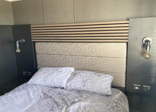 The double bedroom is at the rear of the pod and is provided with bedding. This is a separate room and also has a smart TV located on the wall.