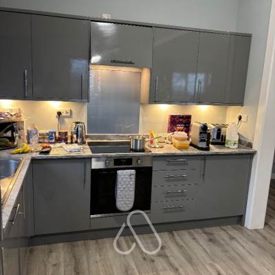 Kitchen corner with microwave, kettle, toaster and fridge - basic crockery provided