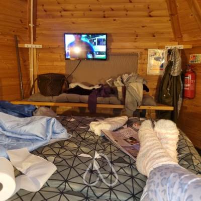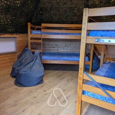 Adventure themed Hexi glamping cabin decorated in a camouflage theme with bean bags and a commando net on the ceiling