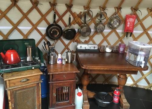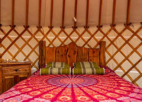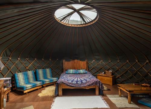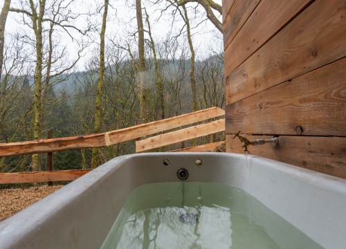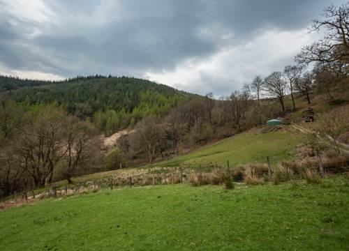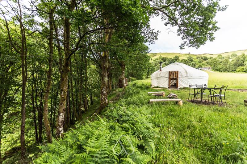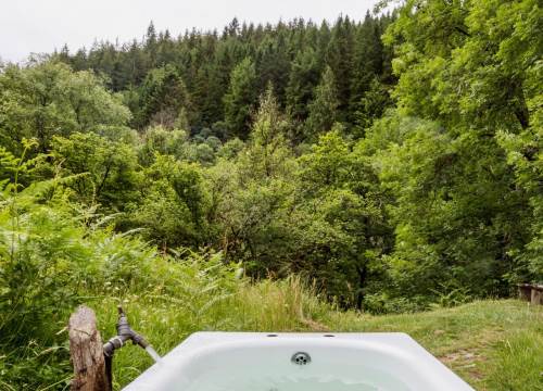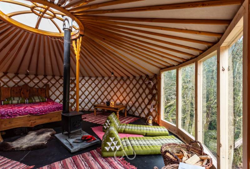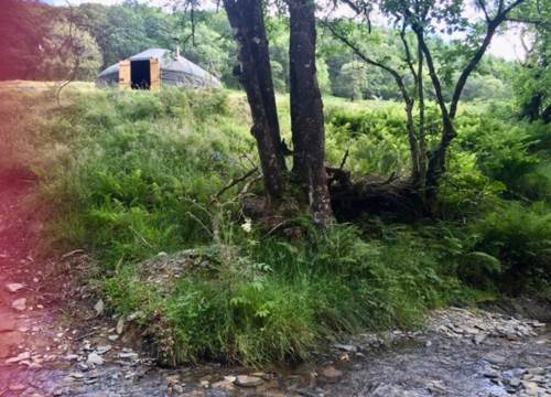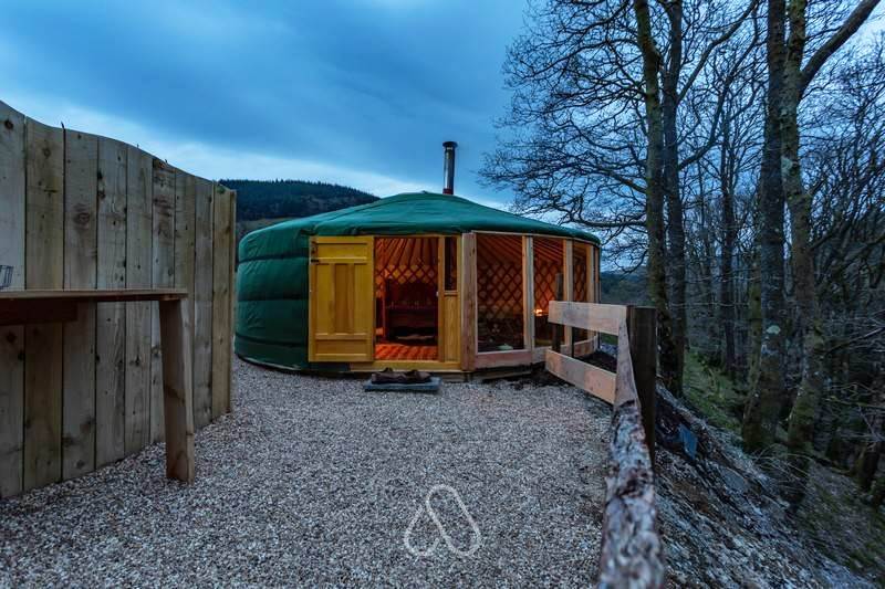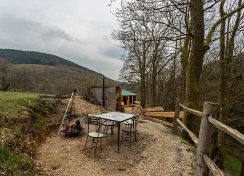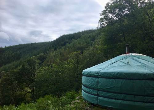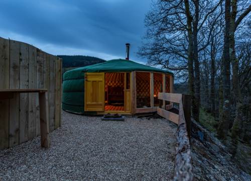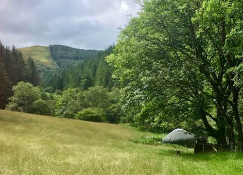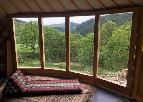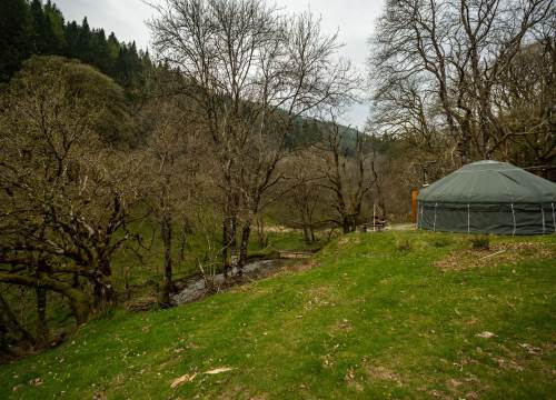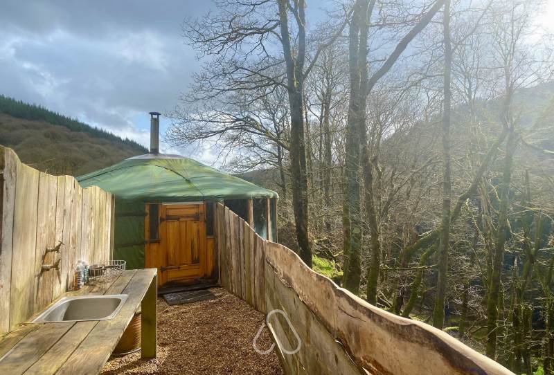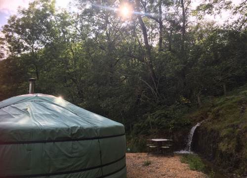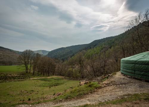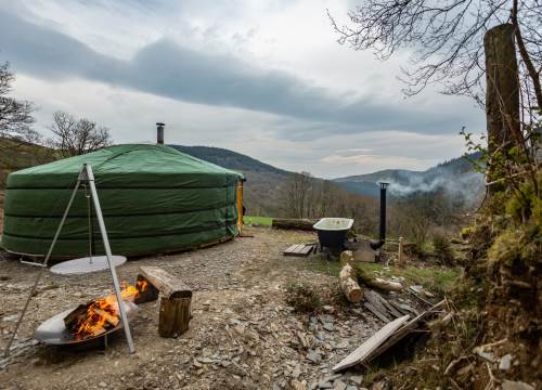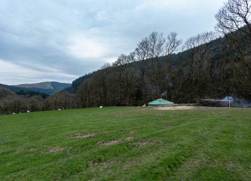Set at the top end of the valley with spectacular views down across the site and valley from the yurt and outdoor bath.