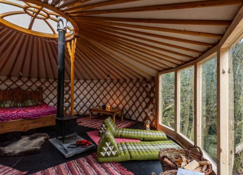 Meadow yurt is located in a beautiful meadow. Sunken into the forest it has the feel of a tree house and the comfort of a yurt and has a lovely sunken bath overlooking the forest. Surrounded by beautiful wildflower meadows and grazing sheep at certain times of the year. This yurt is easily accessible from the guest parking spot in case you want to venture further during your stay.