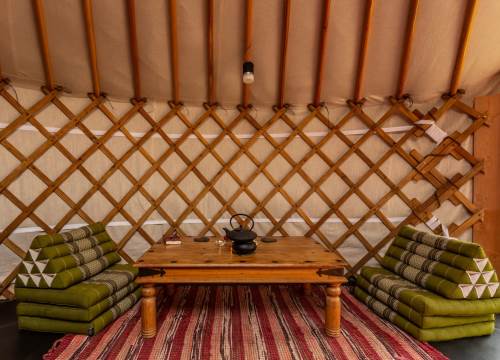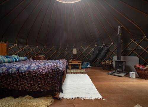 Spread across an expansive 1300-acre farm, just 3 yurts are dispersed over 50 acres to preserve guest’s privacy and the serene beauty of the environment. The yurts are well-appointed with wood-burning stoves and cooking facilities. Each unit is located in its secluded area, away from other guests, featuring a private eco-loo, shower block, and an outdoor wood-fired bath. Outside, discover seating areas and facilities for open fires. With no electricity, the tents are illuminated at night with candles and lanterns.