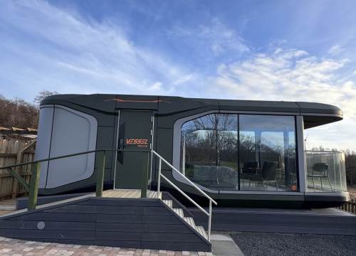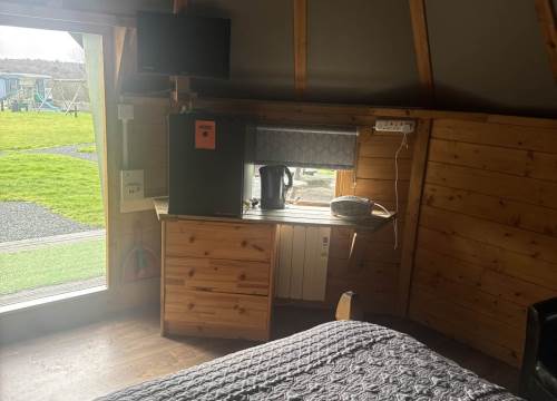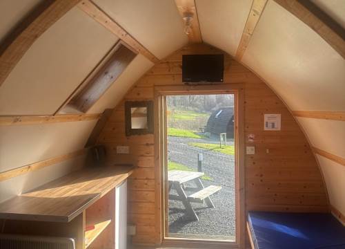 The deluxe pod is equipped with a 32-inch TV, a kettle, electrical plug points, USB points, a radiator, lighting and a mini fridge.