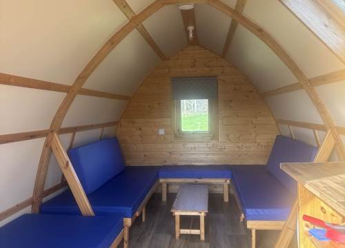 Our Glamping pods have a large bed that converts from seating into a wide bed which can sleep 4 and more seating that converts into a single bed.