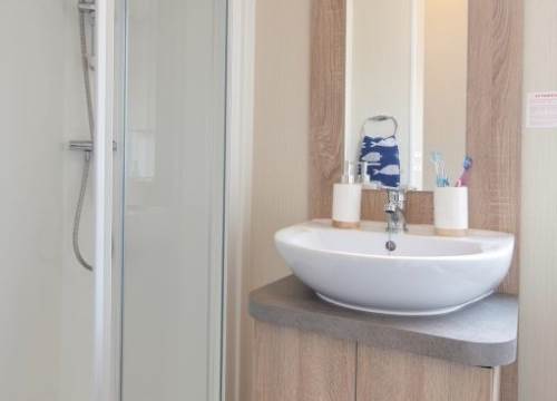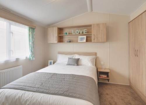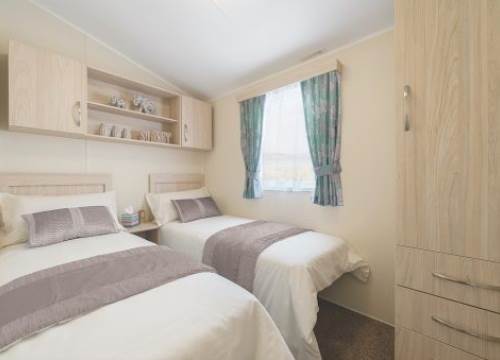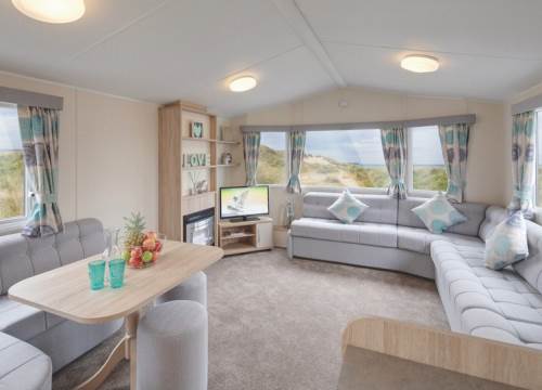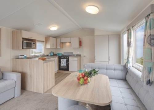 This brand-new model features a generous lounge with comfortable wrap-around seating and warm, welcoming décor with co-ordinated curtains and fabrics. The fully equipped kitchen has a fitted cooker, externally vented cooker hood and space for a free-standing fridge/freezer, with storage space not usually found in a modern holiday home.