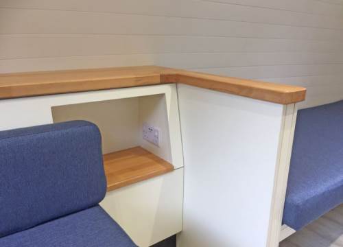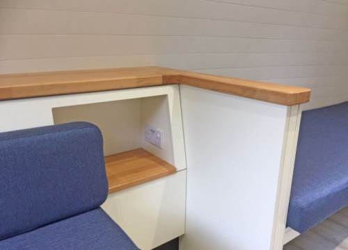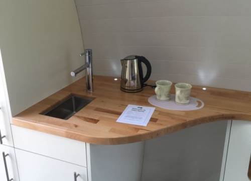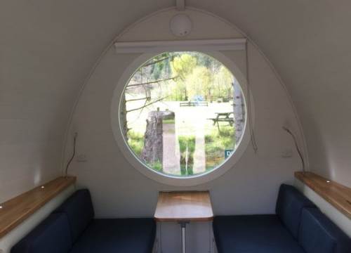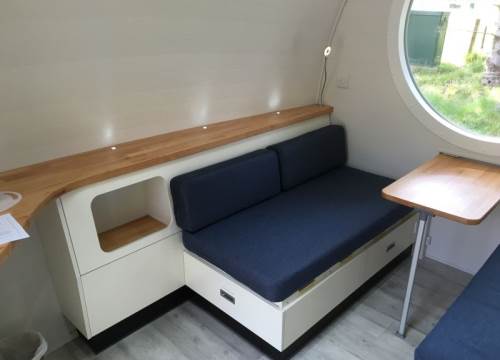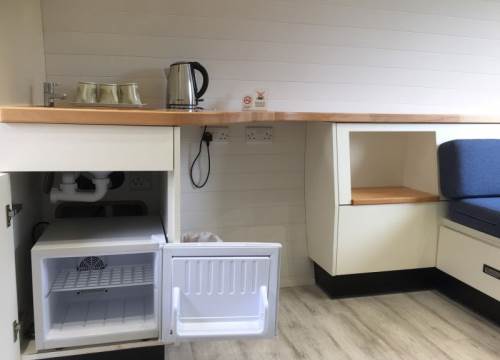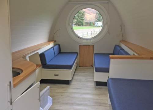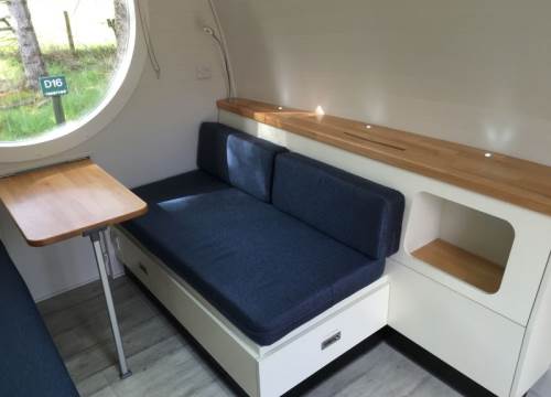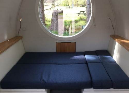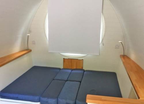 2 bed camping pod with underfloor heating, sink and drying cupboard. Can be setup with double or twin beds.