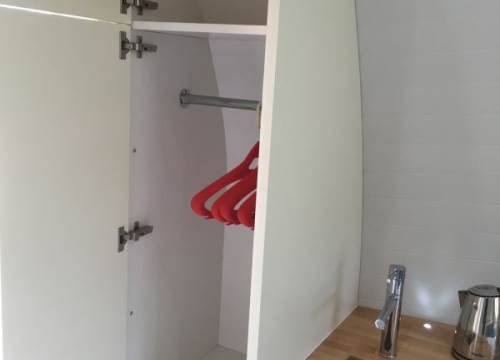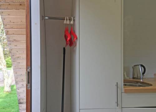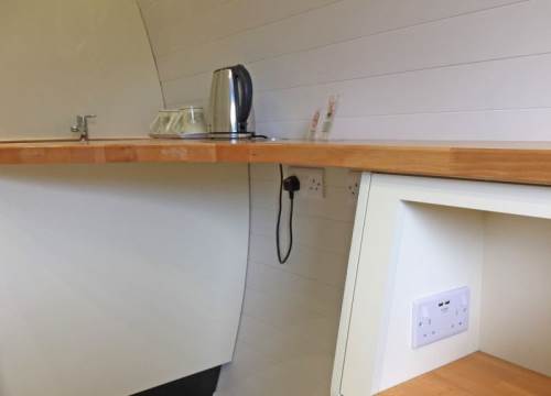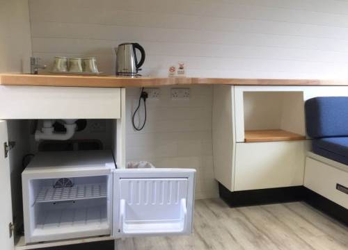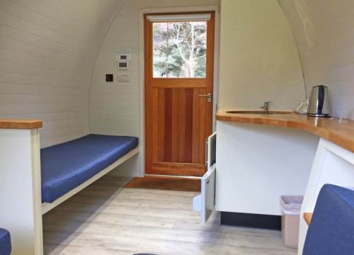 3 bed camping pod with underfloor heating and drying cupboard. Can be setup with three single beds or a double and a twin.