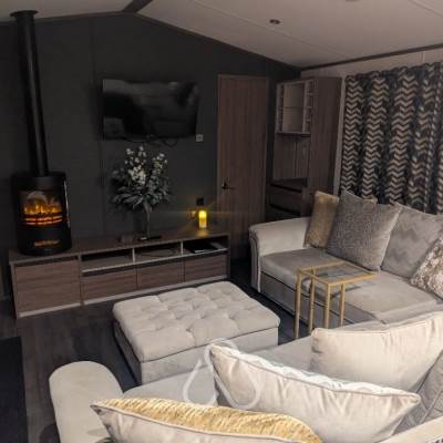 The spacious open-plan living area with dark wood and opulent gold and silver fabrics offers boutique stylish comfort. The large corner sofa, feature coffee table, Bluetooth speakers, and your very own cocktail bar will have you not wanting to leave. Its plush furnishings and rich in texture style give this lodge a huge wow factor. The elegantly designed kitchen dining area boasts an extensive range of clever lighting and an exquisite tasteful finish making it the perfect entertaining space.