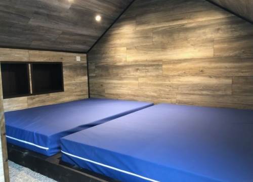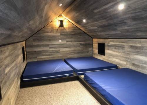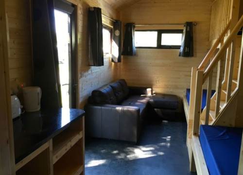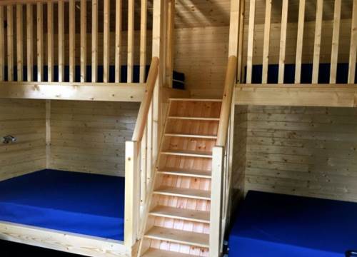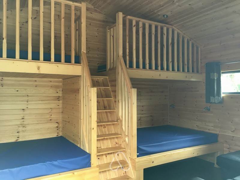 The Loft House Ensuite Glamping Lodge contains two double beds, two single beds, picnic table, small fridge, kettle, lights and heater. A toilet and sink is available in this particular loft house. Adult supervision required for the bunk beds (top bunk only suitable for children over 6 years old).