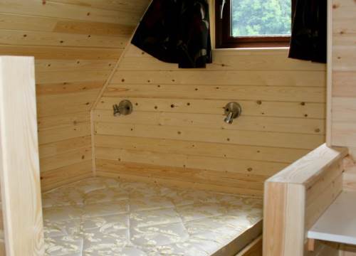 The Loft House Glamping Lodge contains two double beds, two single beds, picnic table, small fridge, kettle, lights and heater. There is no bathroom, however the amenity block with toilets, showers and sinks are located nearby.