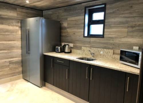 The lodge has a kitchenette with kettle, toaster, fridge, microwave, dishes and cutlery provided. Please note there is no cooking hob or oven in the lodge. The bathroom provides a beautiful walk in rain shower, toilet, sink and heated towel rail.