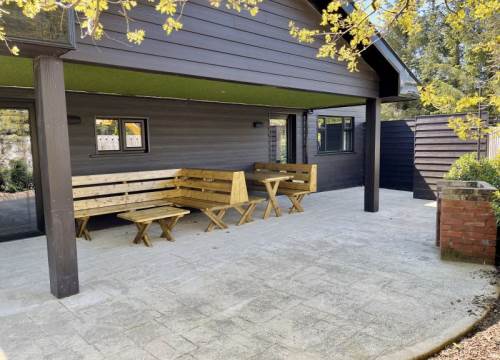 An outdoor patio with picnic table and outdoor barbecue stand is available (for disposable barbecues only).