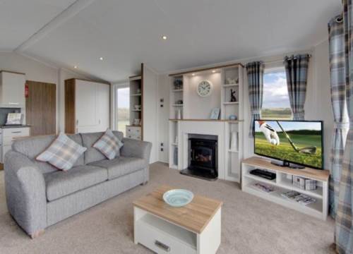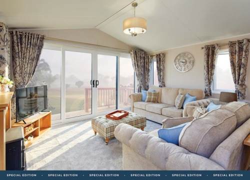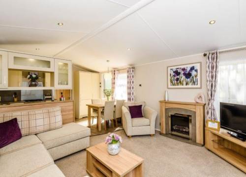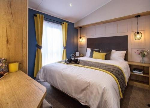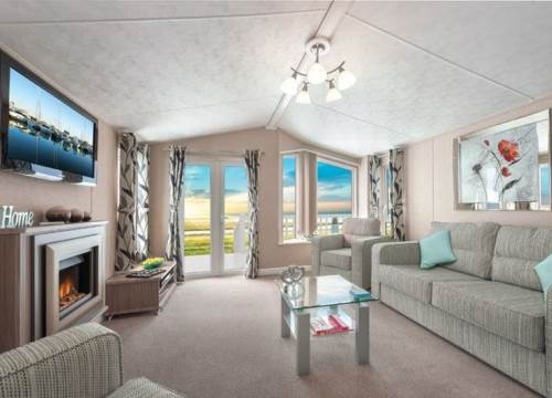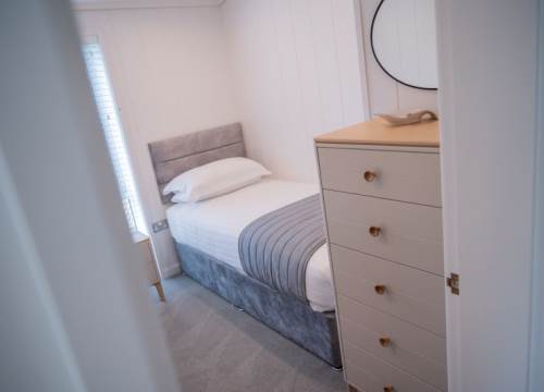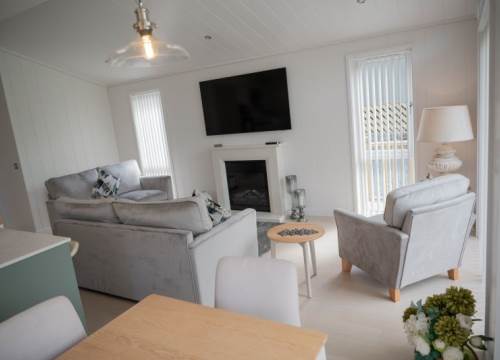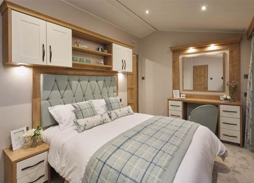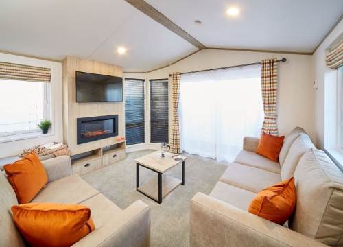 The open-plan living space offers generous seating as well as a stylish feature fireplace, whilst the modern kitchen provides ample storage and a range of integrated appliances as standard. The bedrooms ooze classic sophistication with stylish upholstered headboards and sumptuous curtains, whilst the main bedroom also boasts mirrored wardrobes and an elegant dressing table. The twin bedroom has one 3′ bed and one 2’6″ bed.