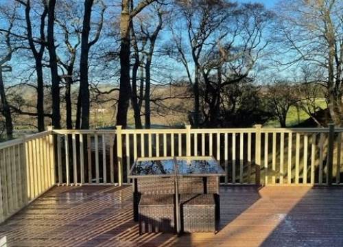 A Lodge with double bedroom with an en-suite shower room, twin bedroom. Open plan kitchen and living room. Enclosed outside decking area.