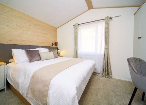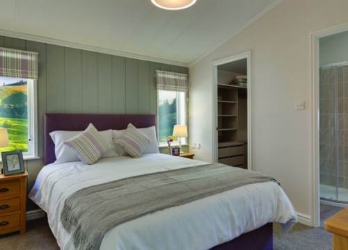 The lounge is slightly separated from the kitchen, making it cosy yet spacious at the same time. The panelled feature fireplace with a clock gives it a country house feel but all around you notice small designer touches, like chrome sockets and switches. You’ll love the ‘his and hers’ sofas with tartan cushions that allow you to gaze out of your huge windows or doors.