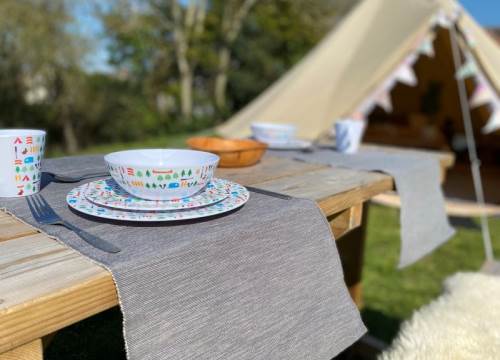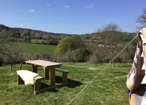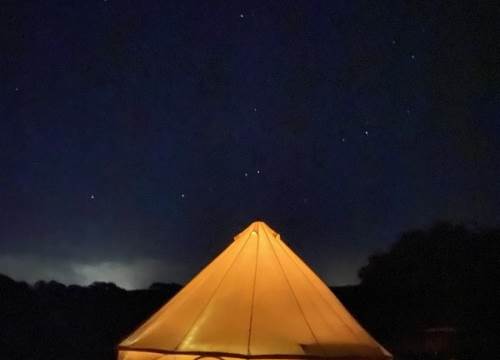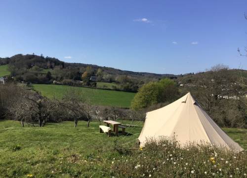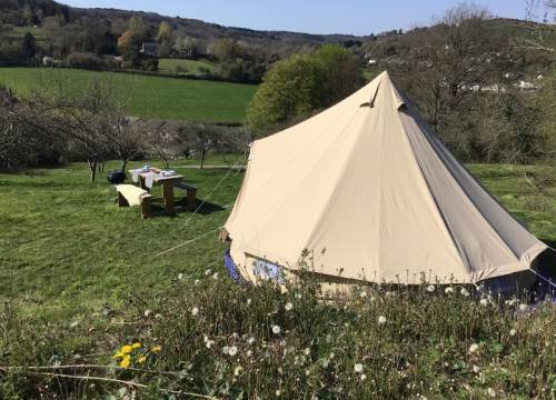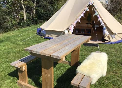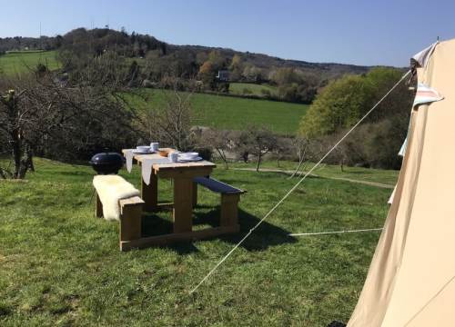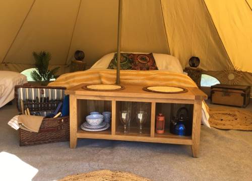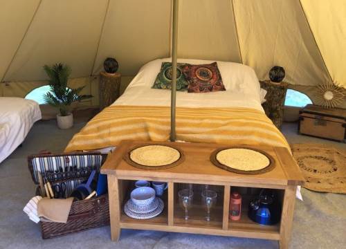 Sitting in a secluded area of our campsite with beautiful westerly views over a valley with the chance of stunning sunsets in the evenings, our 5m Bell Tent sleeps 2 in a real double bed with cosy bedding and basic camp kitchen provided. Extra camp beds for up to 2 children can be requested, but please bring sleeping bags for the children. Inside you will find the double bed made up on arrival, with crockery, basic cooking equipment, table and chairs. The toilet and shower facilities are located in the main toilet blocks shared with campers which is a short walk from your tents. We don’t accept new arrivals on a Sunday.