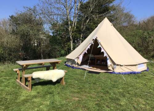 Sitting in a secluded area with beautiful views our stunning 5m Bell Tent sleeps 2 in a real double bed with cosy bedding and basic kitchen