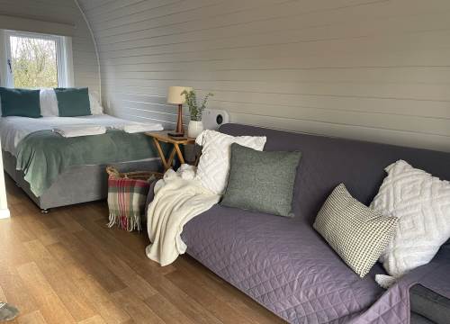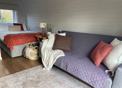 We are proud to offer six fully equipped glamping pods that provide a unique camping experience with all the comforts of home. Each pod includes a double bed, sofa, TV/DVD, ensuite shower and toilet facilities, and a kitchenette stocked with pots, pans, cutlery, and crockery. Beginning in March 2024, we will also provide bedding for our guests, and free WiFi is available in every pod.