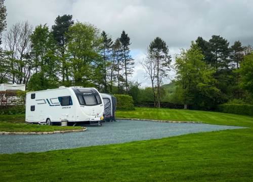 Gravel Hard Standing pitch with 10amp Electric Hook-up. Suitable for Caravans, Campervans and Motorhomes.