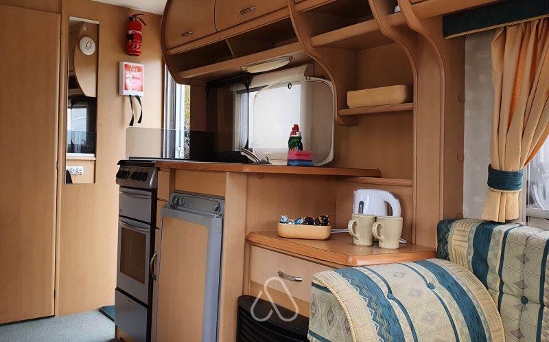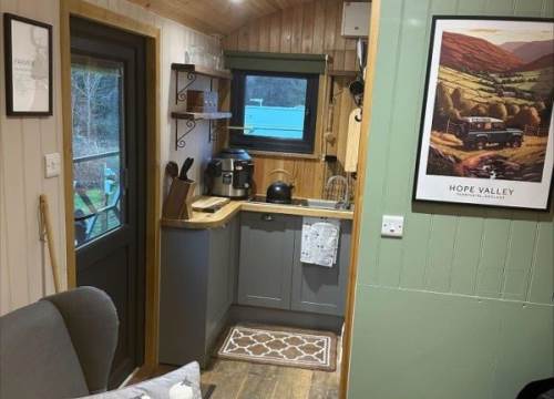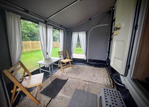 Welcome to your picturesque retreat nestled next to the tranquil River Noe in the heart of the enchanting Peak District. Step inside and be greeted by an atmosphere of warmth and comfort. The interior exudes rustic elegance, with wooden furnishings and soft, inviting textiles creating a cozy haven. As evening falls, imagine snuggling up on the plush sofa, savouring the gentle patter of raindrops dancing on the roof while indulging in your favourite TV shows. Then, when you are ready for bed, enjoy a peaceful night's sleep in the fixed double bed in the bedroom area. So, you don't need to make the bed. Ursula now features a spacious awning for those looking to extend their living space outdoors. This additional area is perfect for dining al fresco, shedding outdoor clothes, and storing essentials like bikes. It offers an excellent way to enjoy the fresh air while staying protected from the elements.