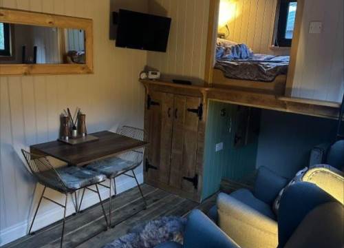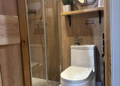 Starter log basket included, and log packs are available to buy from the office. The kitchen, though petite, is well-equipped, allowing you to prepare simple meals during your stay. The bathroom boasts a spacious shower and toilet facilities for a luxury touch. A Smart TV and comfy armchairs can be found in the living room as well as a small fridge freezer in the cupboard under the bed.