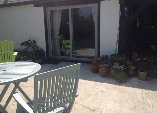 The kitchen has electric hob and oven,microwave,kettle and toaster. the outside space has a table and chairs for alfresco dining and has lovely pots of summer plants around the patio area.
