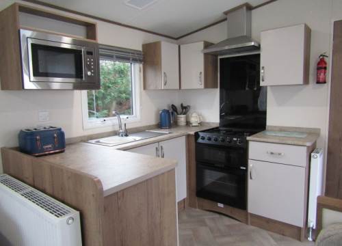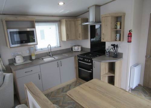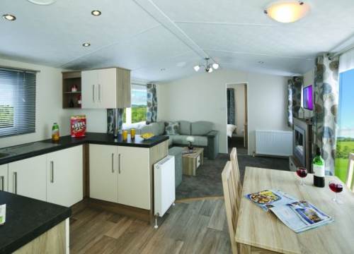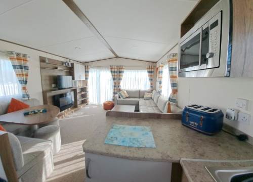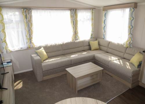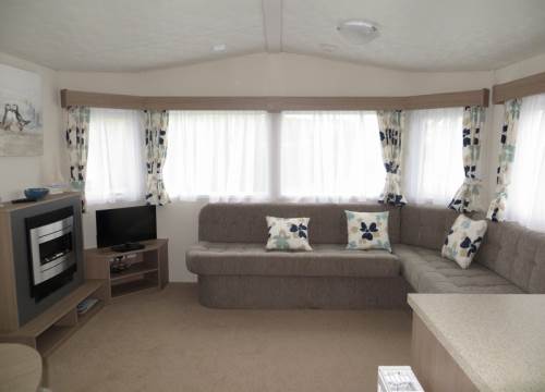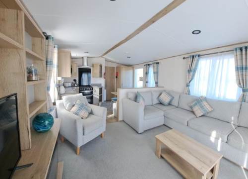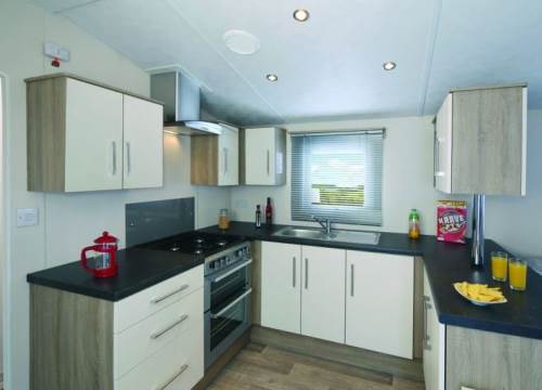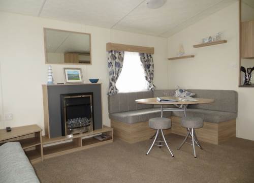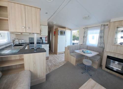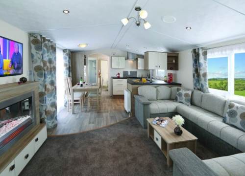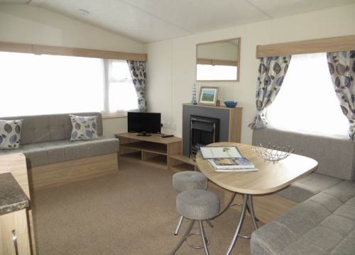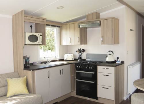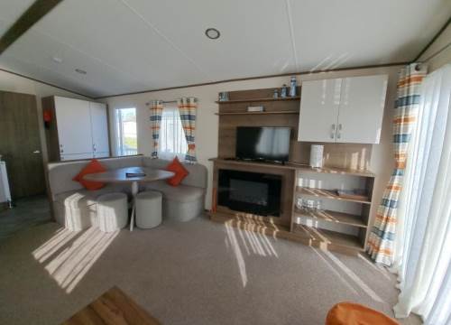 A beautifully appointed holiday caravan with modern and striking features throughout. The lounge has soft L-shaped seating, an electric fire and ample drawer, cupboard and shelf storage.