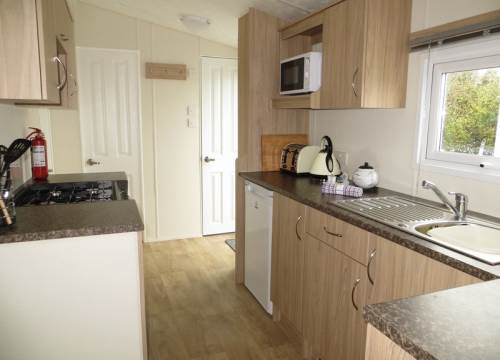 Inside our fantastic Perprean holiday caravan you will find a bright and airy living space offering plenty of seating and a fixed dinette. The kitchen is u-shaped and is fitted with a range of contemporary units and integrated microwave and fridge/freezer. There are front opening doors which lead onto a spacious decked area complete with outdoor seating.