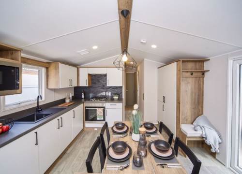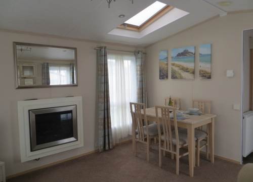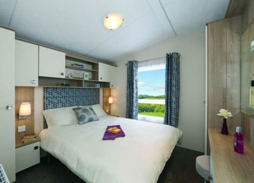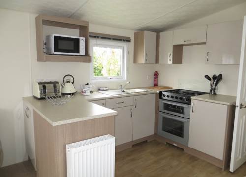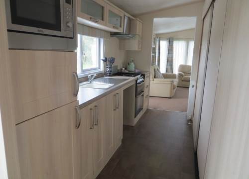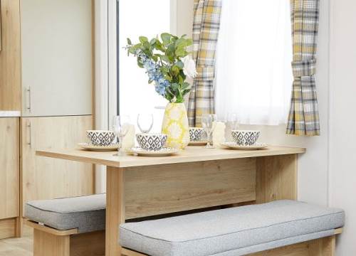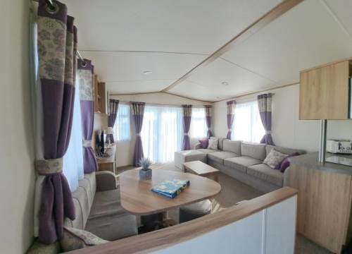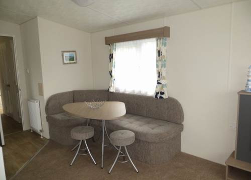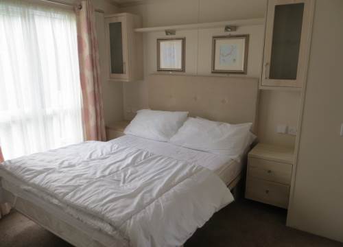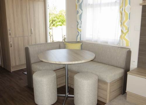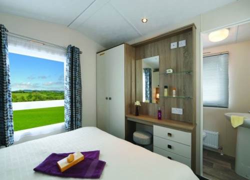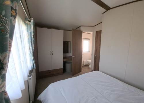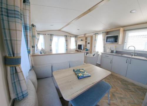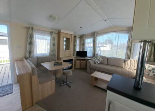 The well-equipped u-shaped kitchen with dining table is a pleasant place to prepare and enjoy meals together. Bedrooms are spaced apart at each end of the holiday caravan, and the main bedroom includes a walk-in wardrobe and en-suite facilities.