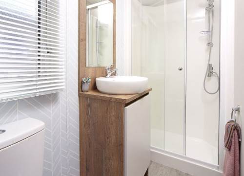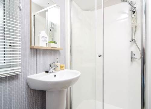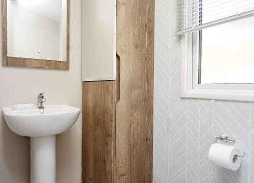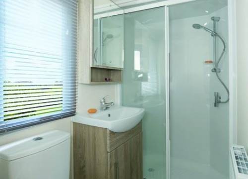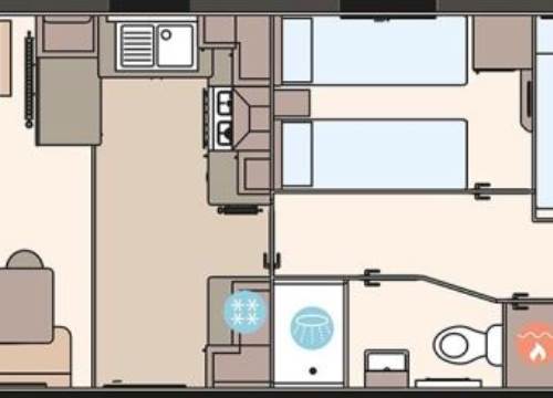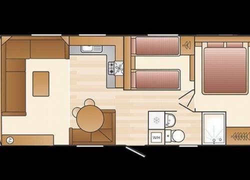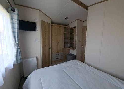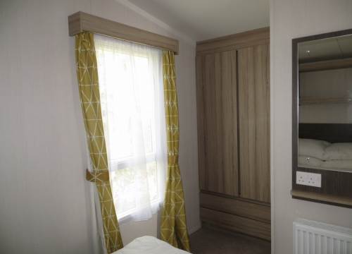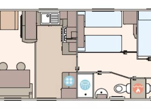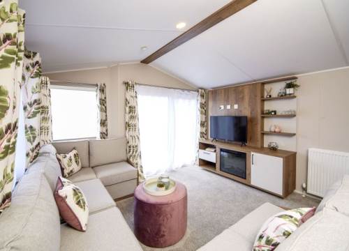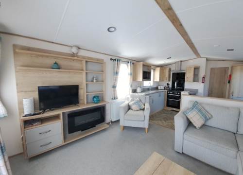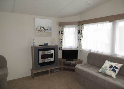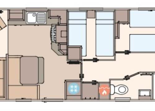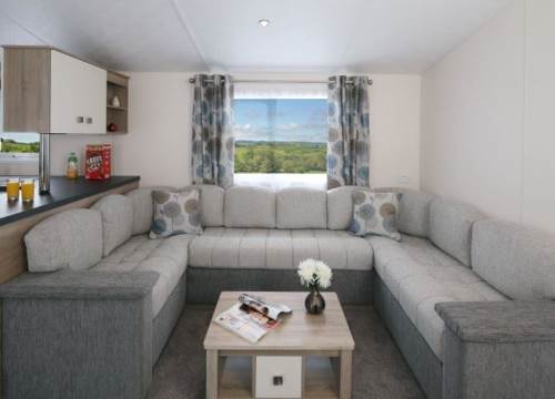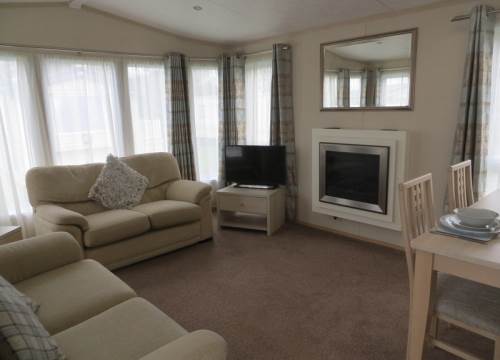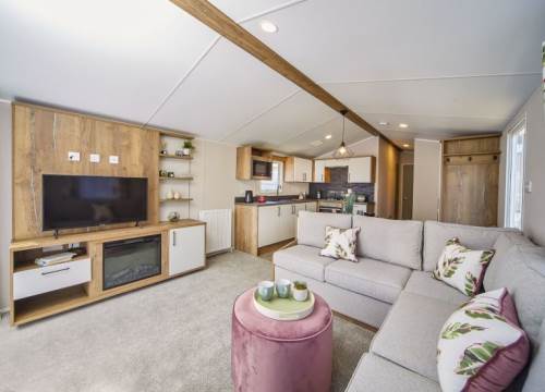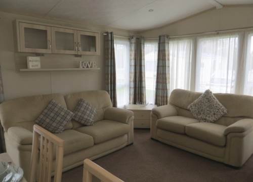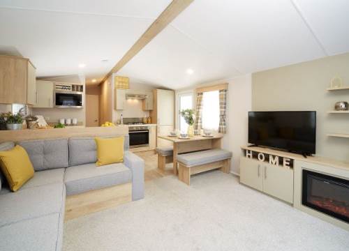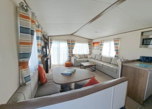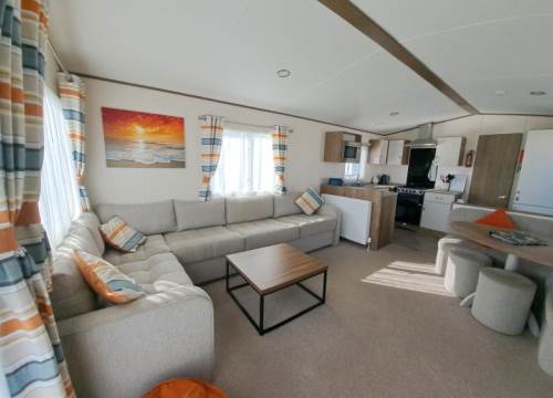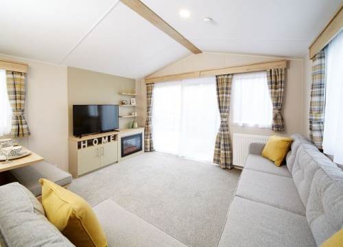 This model is a large two-bedroom holiday home sleeping up to four people. A beautifully appointed holiday caravan with modern and striking features throughout. The lounge has soft L-shaped seating, an electric fire and ample drawer, cupboard and shelf storage.