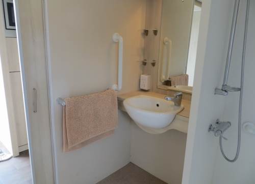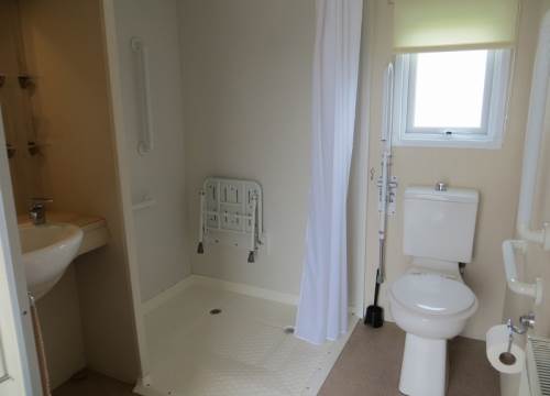 | Accessible main shower room with large shower area with fold out seat and support rails | |