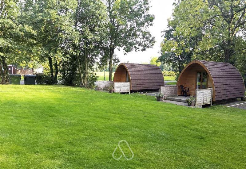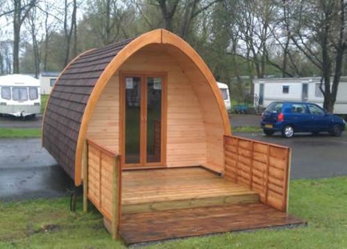 Camping pod with small decking, 2 chairs. Pods have sheep’s wool insulation for warmth in winter and cool in summer Price includes 2 people and a car.