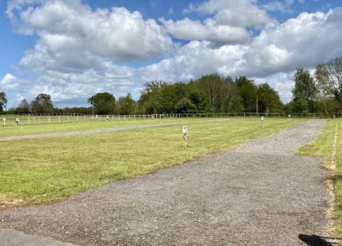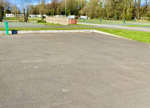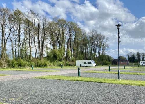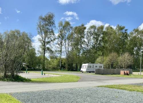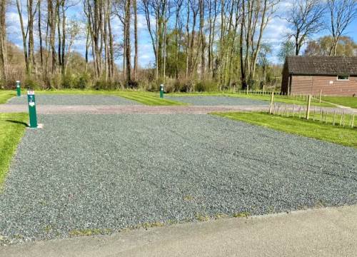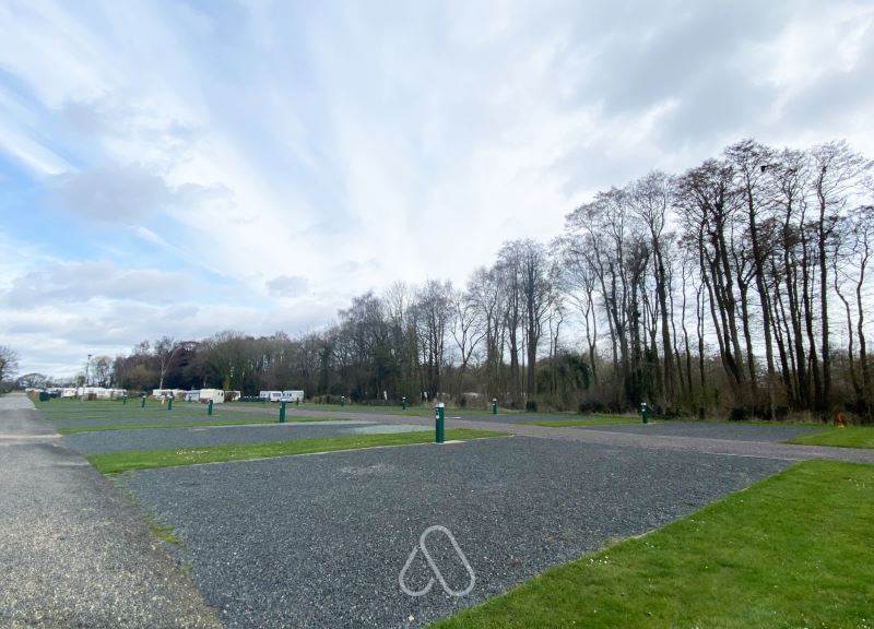 The RV Hard standings are on the left-hand side of the main road up the middle of the caravan park by red toilets. It is just a short walk through the woods to one of the play areas and are at the same end of the caravan park as a swimming pool and shop.
