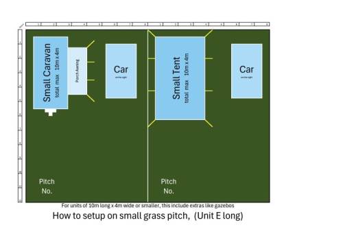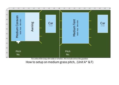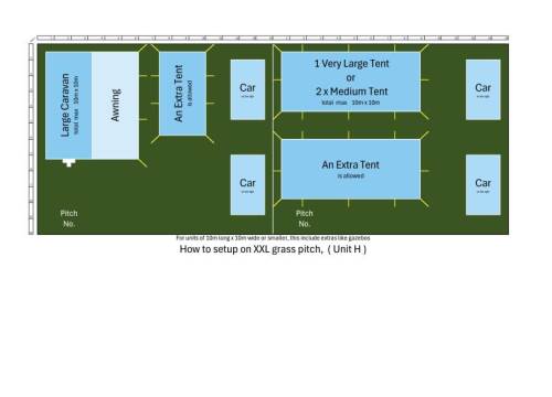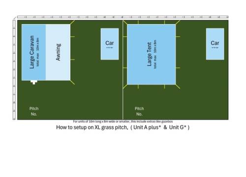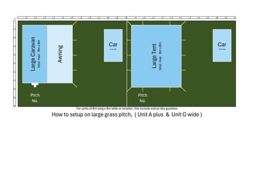 Good for the larger families, in a very large tent or caravan with extra wide awning or caravan with small awning and a small tent 2x3m, all units must fit within the maximum unit size of 10m long x 8m wide to allow a safety gap between pitches, this must include extras like gazebos.