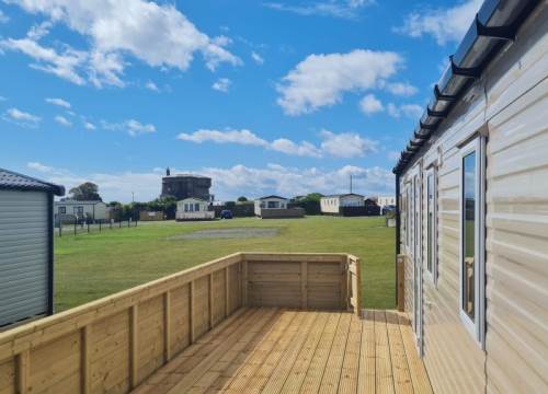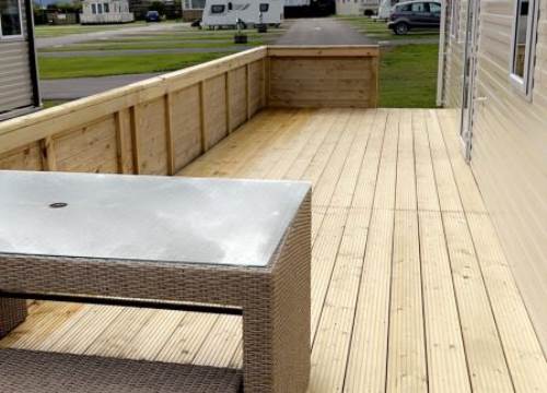 The spacious outdoor decking area is furnished with table & seating with views of our park and meters to beach access.