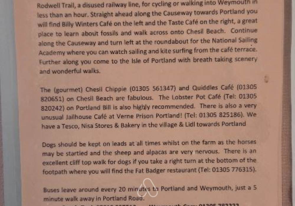 Great location for the bars and restaurants of Weymouth, which was fantastically good fun on new years eve. But also far enough away to enjoy the silence and beautiful sunsets with stunning views.Will definitely visit again to enjoy coastal walks and the beach.Thank you
