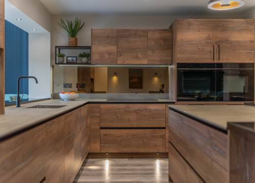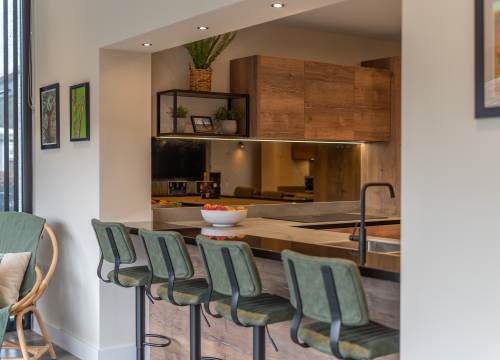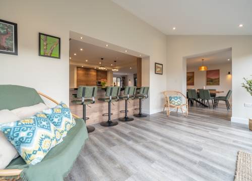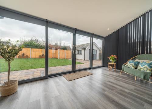 Modern open Plan kitchen/living area with huge new sliding triple glazed windows leading out onto outside terraced seating area with lake views