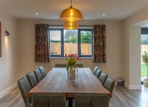 - Open plan lounge/kitchen/dining room with smart TV, electric fire and dining table.