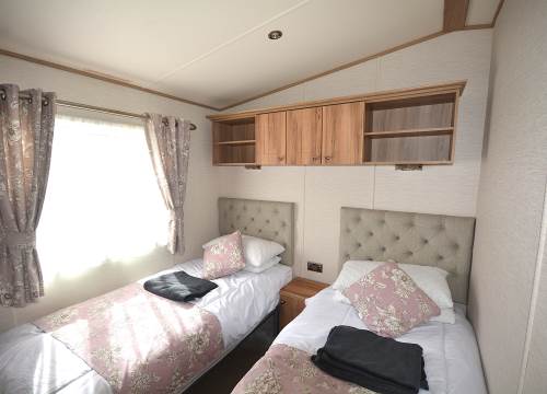 Three bedrooms: The caravan comfortably sleeps up to eight people, with three stylish bedrooms. The master bedroom features a 4'6" double bed with a fabric button headboard, fitted wardrobes, and an en-suite WC and basin. The two twin rooms each have two single beds and fitted storage.