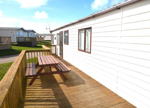 Pet Friendly 3 bedroom static caravan for hire at Perran Sands, Perranporth, Cornwall. Includes decking area and sleeps 8 guests.