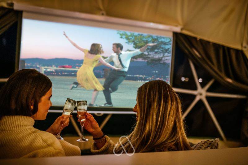 Part of the unique charm of a Geodome is they are completely open plan; the bedroom & living space is all rolled into one. This functional, cosy space includes a large snug corner sofa and 50in Smart TV.. It really is the perfect location to snuggle up, relax and enjoy some quiet time.