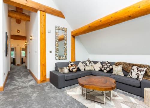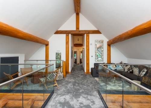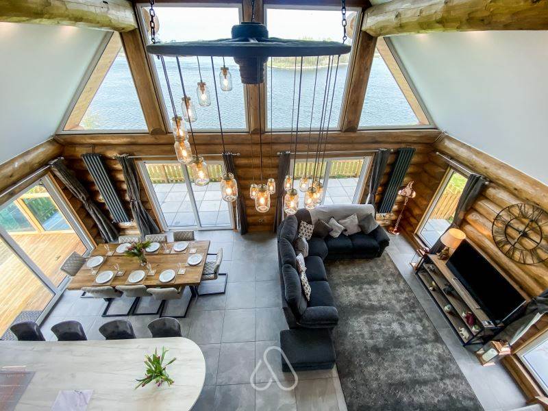 - Open plan lounge area on the first floor with L shaped sofa, and lounge chairs with spectacular views through the glass balcony overlooking the lake