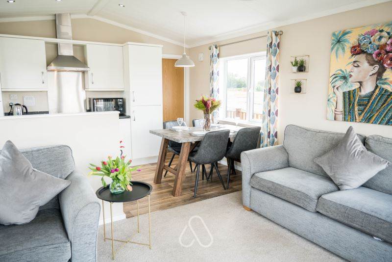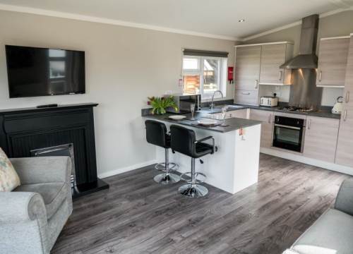 The Sunset View 2 Lodge has just 1 bedroom and sleeps just 2 guests – The living area is open plan, with vaulted ceilings throughout creating a feeling of space, with a contemporary kitchen, breakfast bar and beautiful lounge with French doors onto the decking, and spacious bedroom with walk-in wardrobe and amazing bathroom with a roll top bath and separate shower. Please note: Photographs are for illustration purposes only; actual interior may slightly differ.