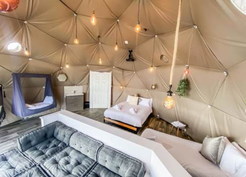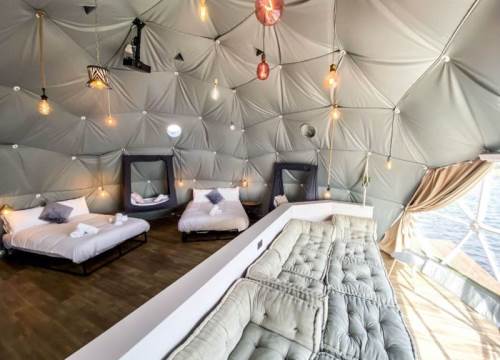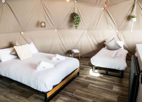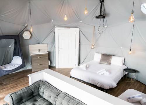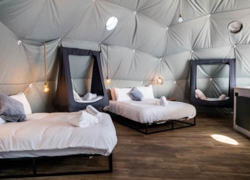 The bed configuration is: 1 x king size bed, 1 x double bed & 2 x hammock suitable for 2 child strictly up to 120cm. (Sleeping a total of 4 adults and 2 children). Linen and towels are provided. There is also a small sink with running water in each dome, along with full central heating (so no need to pack your thermals!)