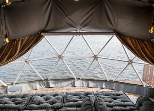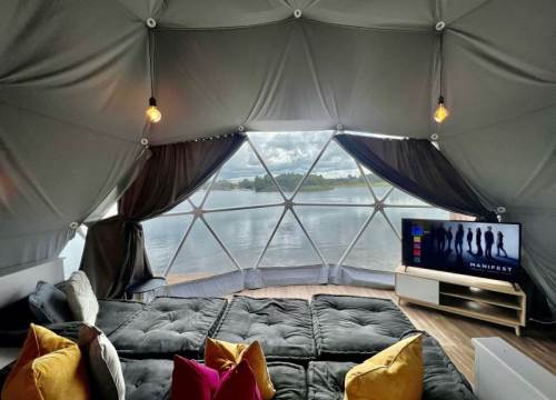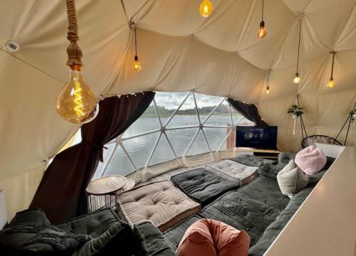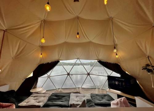 Deluxe Geodome with private hot tub overlooking the lake. Sleeps up to 4 adults and 2 small children in special sleeping hammocks (up to 120cm).